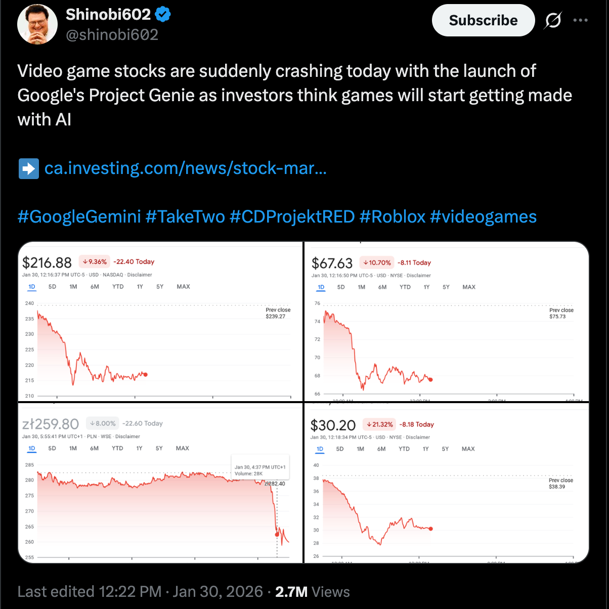 So when recent news from Google’s Project Genie sent video game stocks crashing this week, I thought about the above lessons.