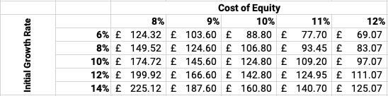 Below is the GW valuation range assuming various cost of equity and initial growth assumptions in the H-Model. The constants are a 30 year extraordinary growth period, an initial 10% annual growth rate, and a 3% stable/terminal growth rate.