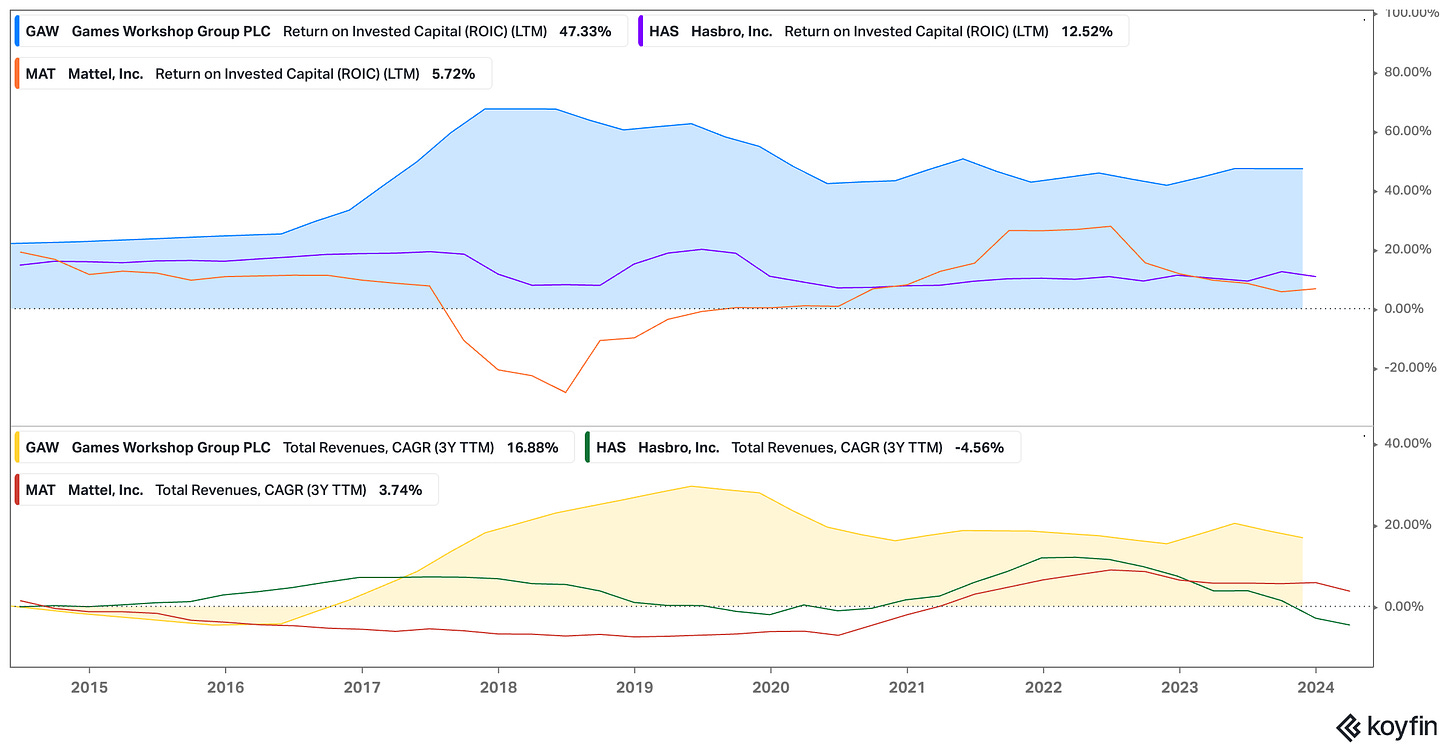 GW has a different ROIC and revenue growth profile from Hasbro and Mattel, making multiple comparisons tricky.