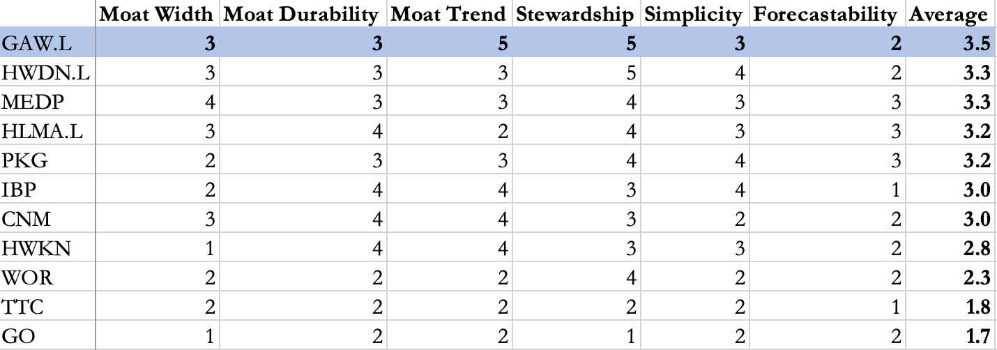 Here's a breakdown of the above scores, alongside my scores for the other companies profiled thus far at Flyover Stocks.