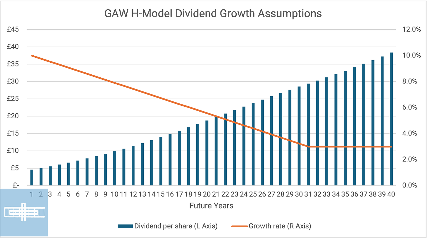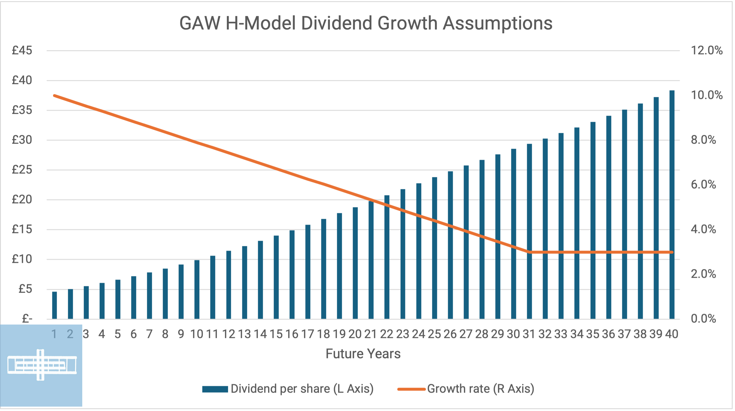 Graphically, here’s what the H-Model assumes for the dividend per share (roughly FCF per share) and annual growth rates.