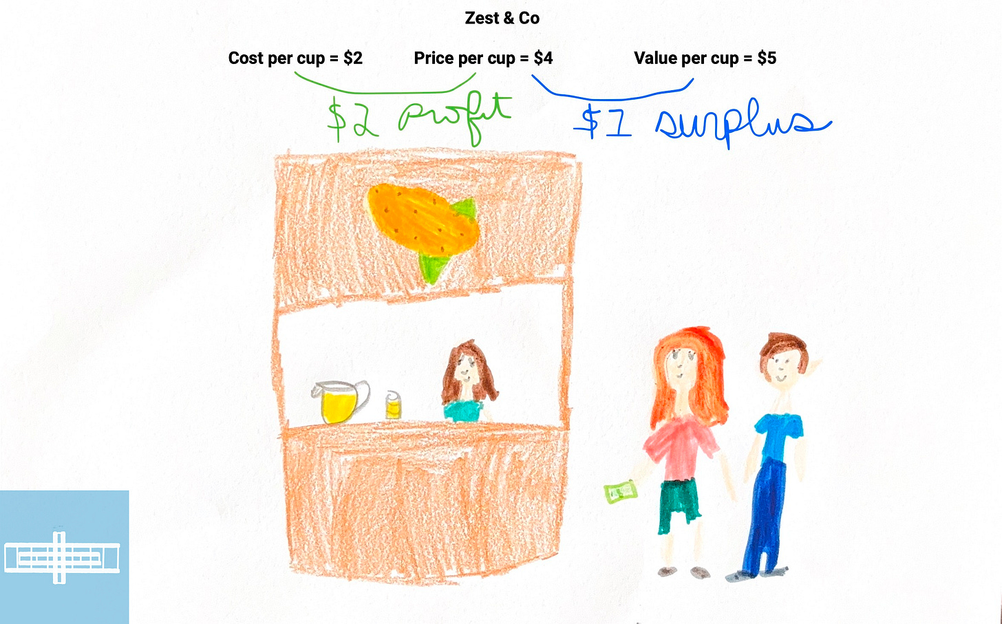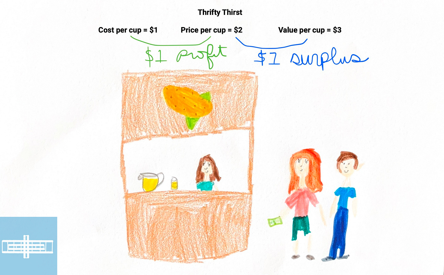 In this case, the lemonade stand - we’ll call it Thrifty Thirst - operates in a competitive market where the market price is $2.50 per cup. Let’s say customers assign $3 per cup of value.