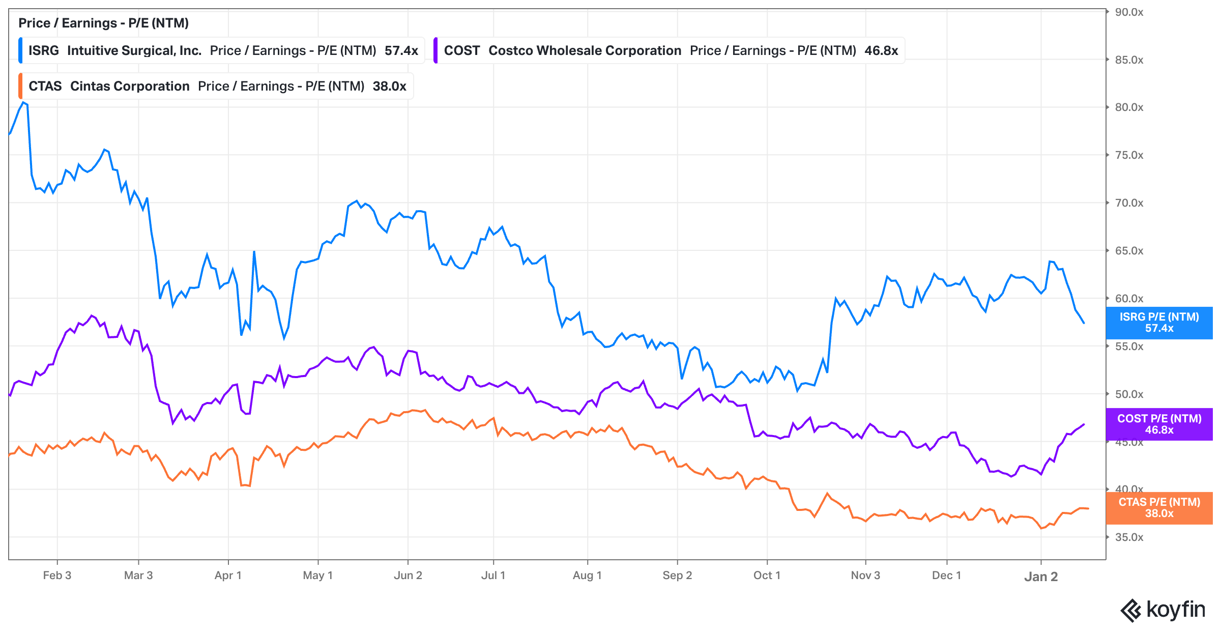 It’s hard to argue that companies like Intuitive Surgical, Costco, and Cintas aren’t great businesses, but at their current price/earnings multiples, anyone who still claims to be a card-holding member of the Value Club has to be skeptical of future returns.
