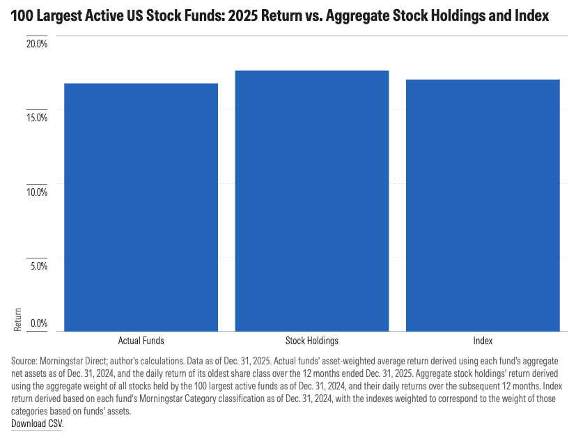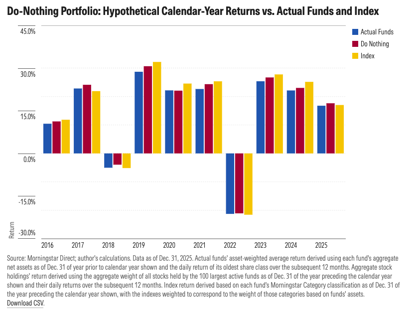 Jeff Ptak, Managing Director of Morningstar Research, recently studied the 100 largest active U.S. stock funds. He compared their actual 2025 performance against a hypothetical "Do-Nothing" portfolio, which took the funds' exact holdings from the start of the year and simply froze them (no buying, no selling) for the next 12 months.