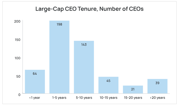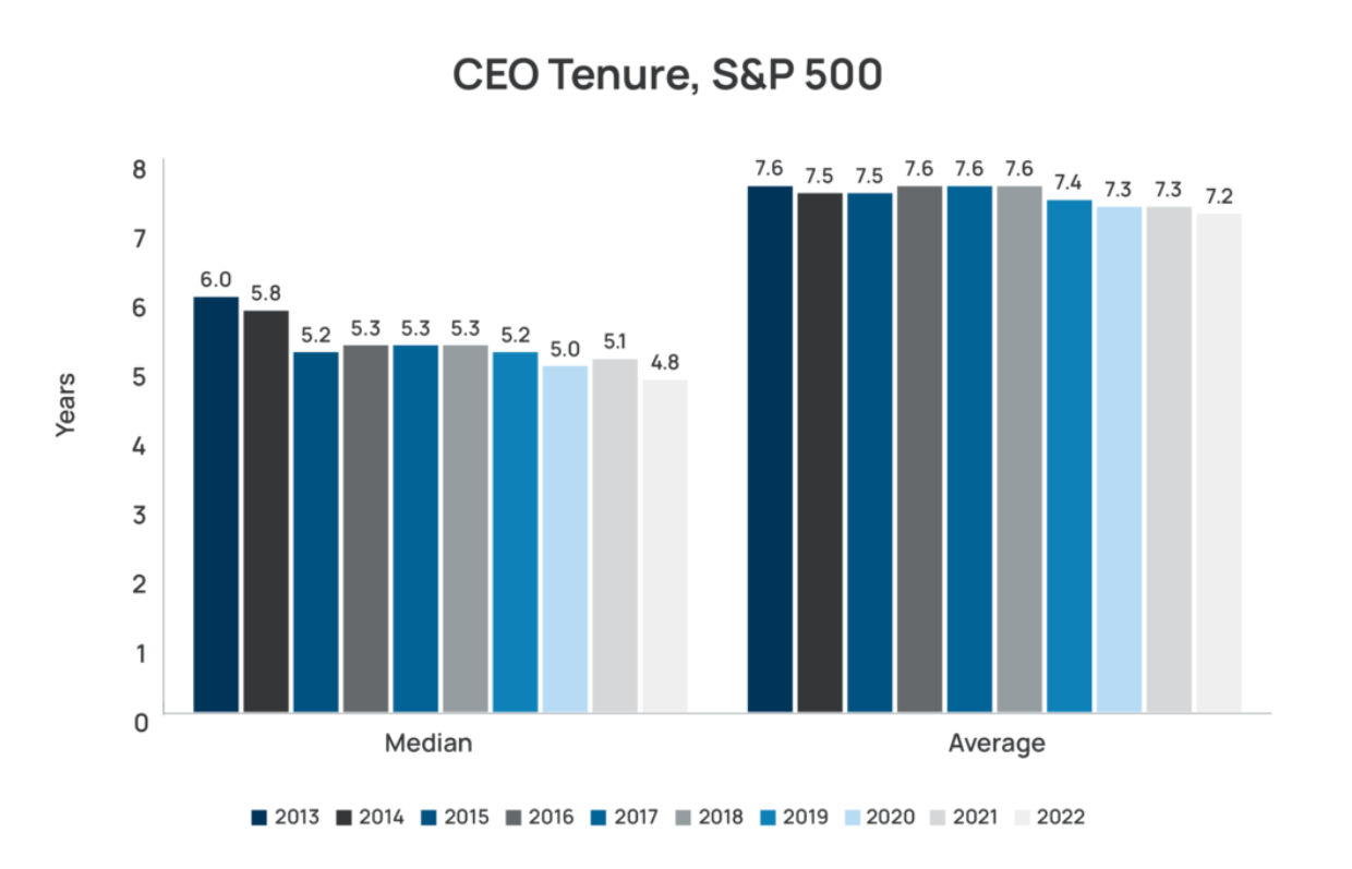 According to Equilar, the median S&P 500 CEO tenure is about five years, and it’s stayed around that level since 2015.