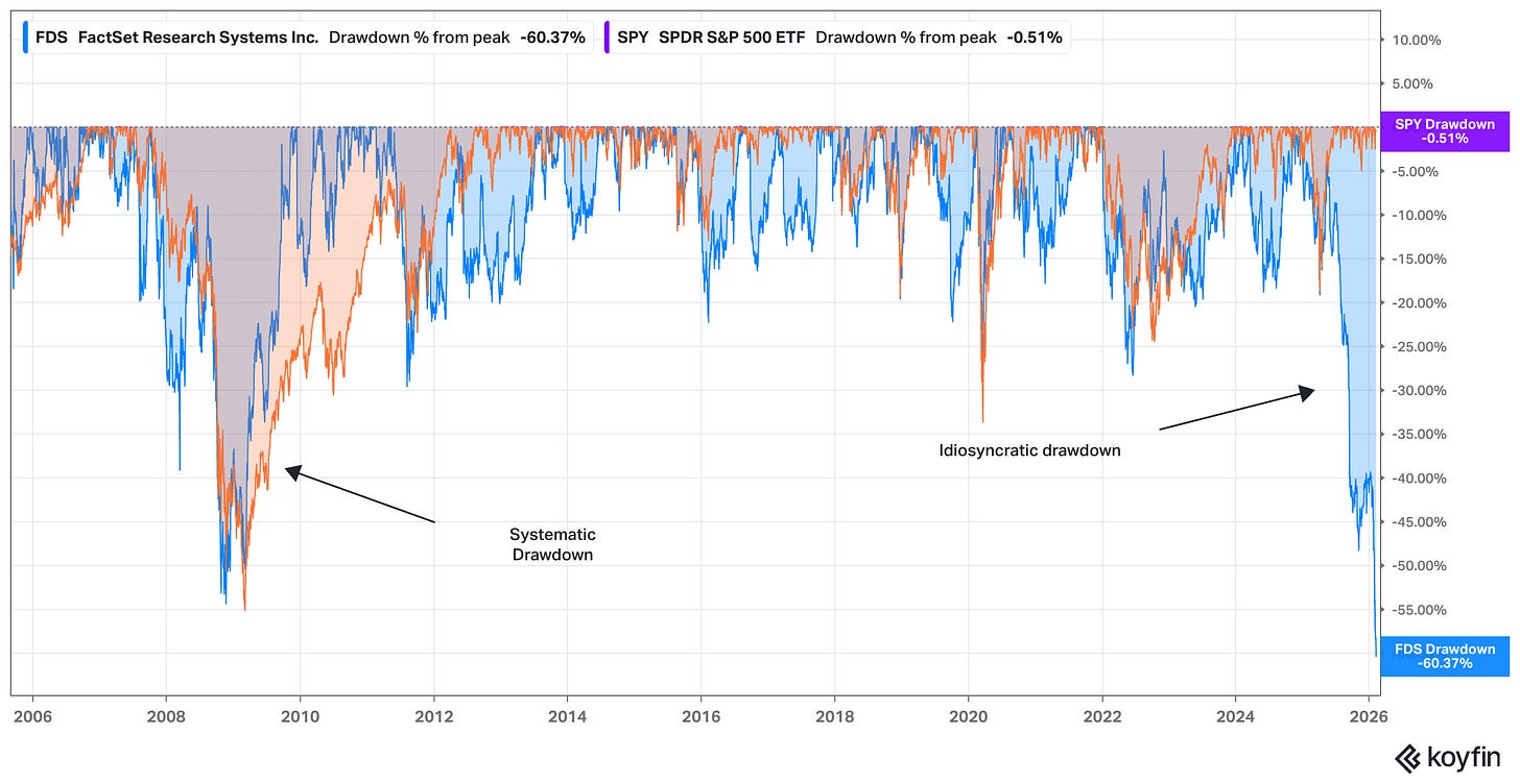 The recent selloff in software stocks due to AI worries illustrates this point. Let’s look at 20 years of drawdown history between FactSet (FDS, in blue) and the S&P 500 (as measured by the SPY ETF, in orange).